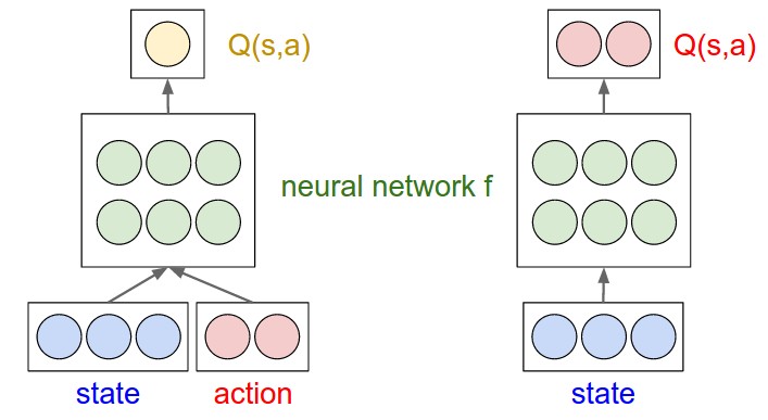 **Modeling Q(s,a)**. First, as mentioned we are using a function approximator to model the Q function: \\(Q(s,a) = f\_{\theta}(s,a)\\). The natural approach to take is to perhaps have a neural network that takes as inputs the state vector \\(s\\) and an action vector \\(a\\) (e.g. encoded with a 1-of-k indicator vector), and output a single number that gives \\(Q(s,a)\\). However, this approach leads to a practical problem because the policy of the agent is to take an action that maximizes Q, that is: \\( \pi(a \mid s) = \arg\max\_a Q(s,a) \\). Therefore, with this naive approach, when the agent wants to produce an action we'd have to iterate over all actions, evaluate Q for each one and take the action that gave the highest Q.