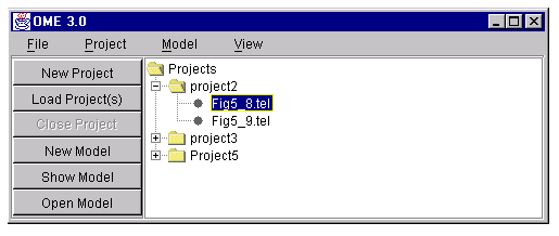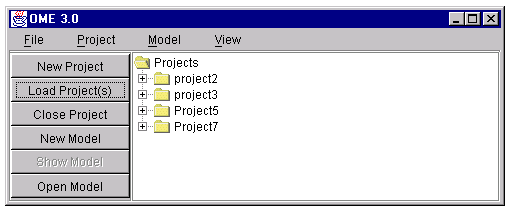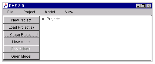 This window consists of the OME Project View Manager, which is used to organize the various models developed. In OME, it is recommended but not necessary that all models be stored within projects. Thus at this stage, the first step typically consists of either creating a new project or opening an existing project. Once this has been done, the user can either modify existing models or create and develop new models within this project. (The user also has the option to open models that are not stored directly in any project, but as mentioned above, this is discouraged). Each of the possible options is described next.