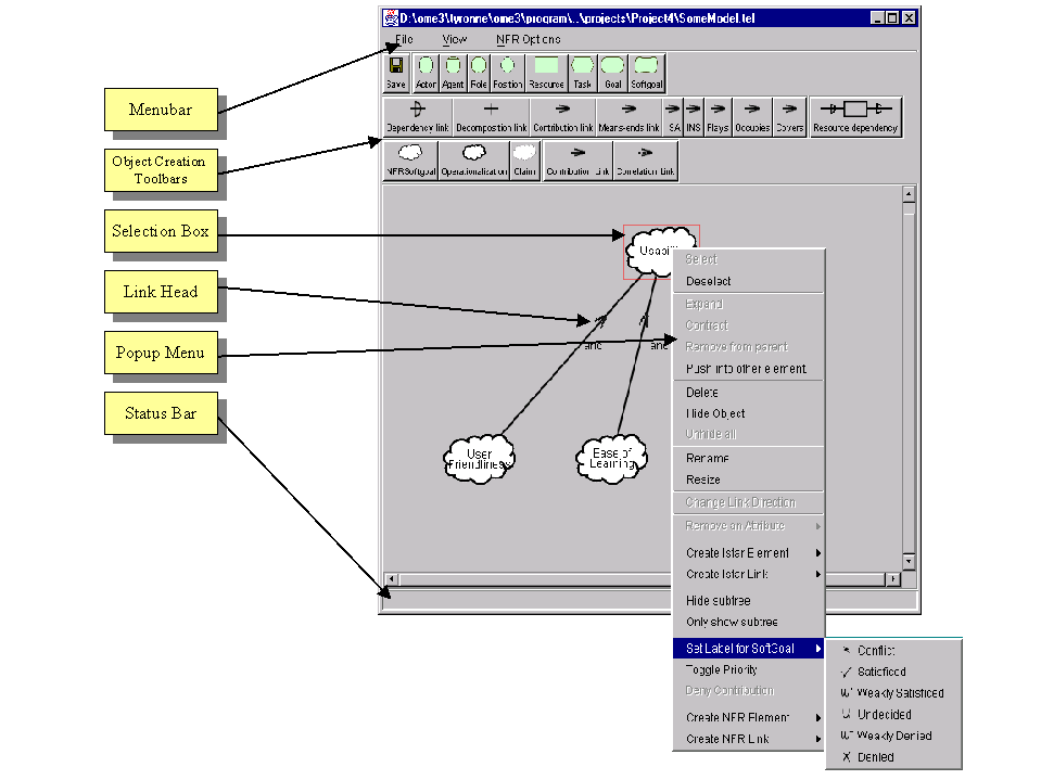 NOTE: Unless explicitly stated otherwise, all interaction with menus, buttons, etc. is achieved by using the left mouse button. Many of the interaction techniques support the notion of context sensitivity. This means that they may appear or behave differently depending on the state of the model and interface. The Pop-up Menu is intended to be particularly context sensitive. In Figure 8, the Pop-up Menu was displayed in response to a right click on the "Usability" node. Notice the "Set Label for Softgoal" menu was active in this instance. This would not have been the case had click occurred over an empty area of graph, or over an object that was not an NFR Softgoal.