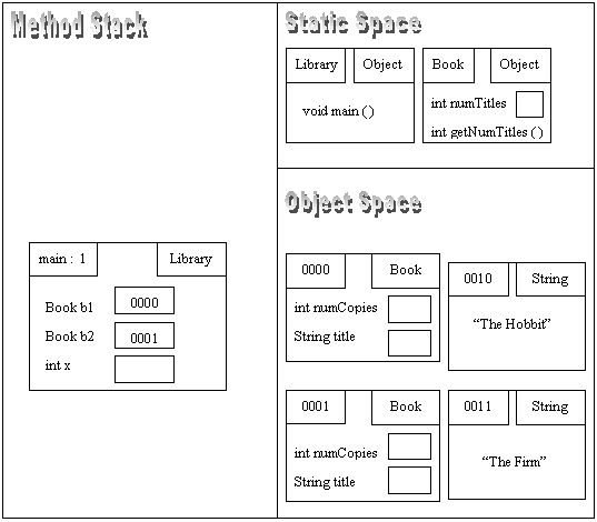 Where should we store numTitles in the memory model? It doesn't go in the call stack area because it is part of the Book class and continues to exist regardless of what is happening in main(). It shouldn't go inside a Book object because it doesn't belong to an individual Book, but to all of them. So we draw a new area in our model called the Static Space. In this space we draw a box for each class in the program, and list all static variables and methods for each class.