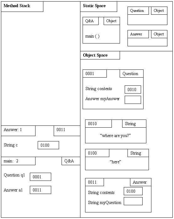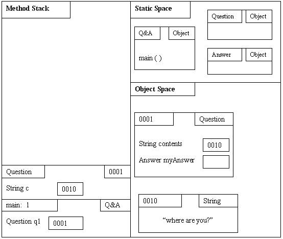 Diagram 1 traces line 1 of the main method just before it completes execution. That is, we can still see the method frame for the constructor of the Question class. Note the parameter (or argument-they mean the same thing) as a local variable inside the constructor frame. For more information on tracing a constructor call in the memory model, see the last page of "Memory Model" on the course website under Lecture 3.