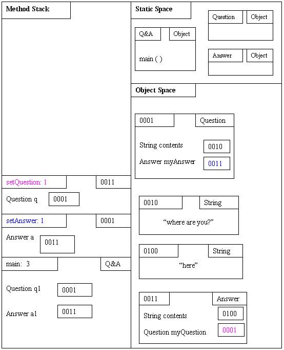 Some memory addresses and method names in this diagram are coloured. The rationale behind the colouring scheme is this: to make the diagram clearer, every variable whose value is directly updated by a method has the colour of that method. So, the method setAnswer() directly updates the value of myAnswer in the q1 object, while the method setQuestion() directly updates the value of myQuestion in the a1 object. (You do not have to use any colouring scheme in your quiz!)
