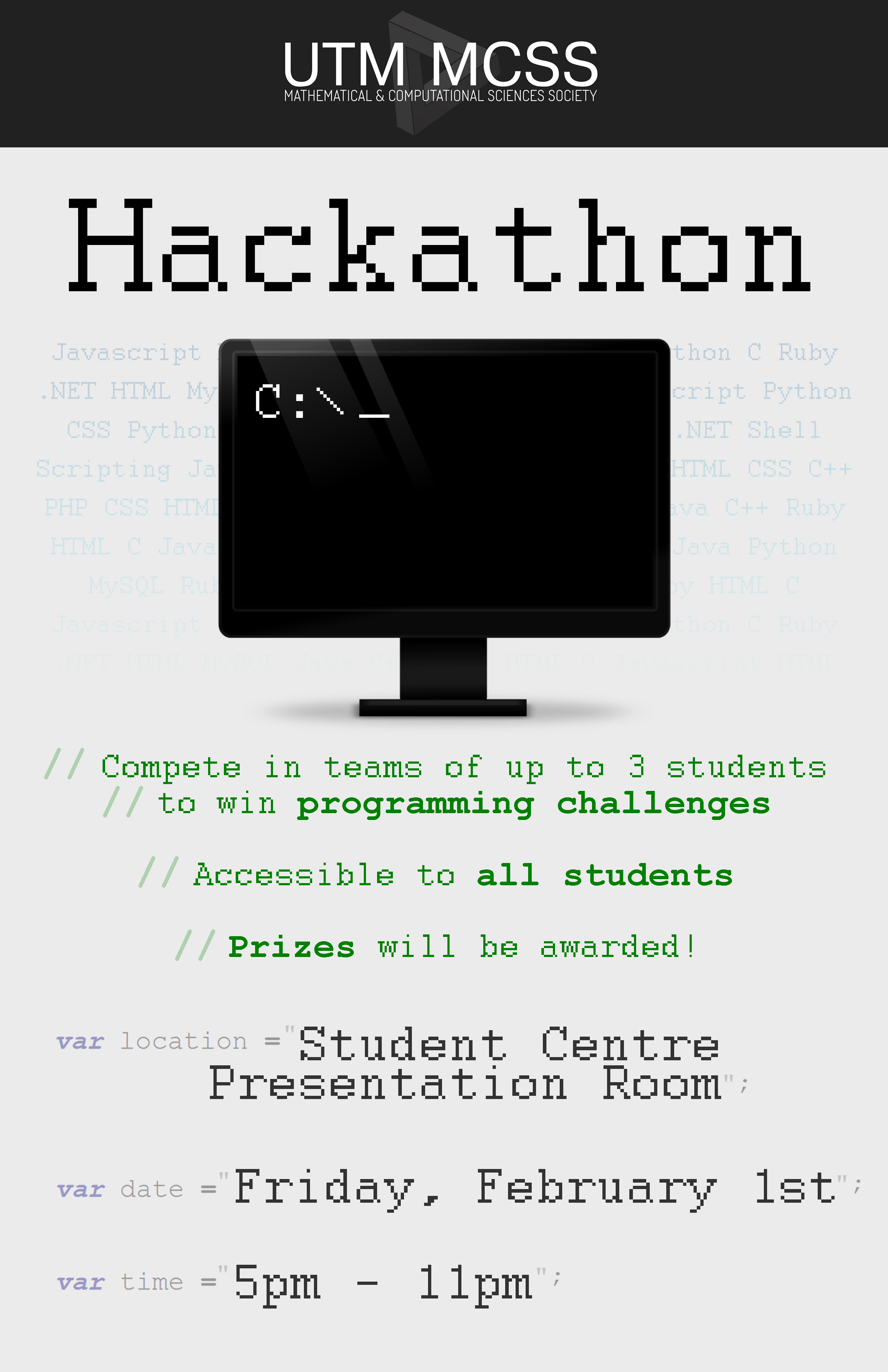 - Prof Trippen is hosting a Hackathon Friday, from 5-11 PM in the Student Centre.