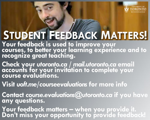 - Online Course Evaluations will be available for UTM undergraduate students beginning March 31st - April 14th, 2013