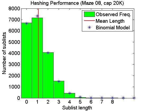 We ran the above hash function on the reachable set for the Maze for level 08. (This maze produced a reachable set of size 22,042.) The capacity was chosen to be 20,000. As a result, the load factor was 1.10, somewhat higher than the default of 0.75.