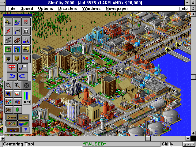 The program also uses a graphical tool bar down the side of the screen. The pictrues show the tool provided. By clicking on the picture you can place that item where ever you want in your city. This tool bar is not hierearchical but is used in the playing or the game.