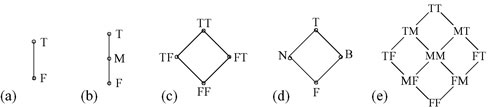 Fig 1: Some example quasi-boolean logics. Note that (c) is a product lattice of two 2-valued lattices. (d) is Belnap's logic, in which B means both true and false, and N means neither. (e) is a product of two 3-valued lattices. We use these structures to give a multi-valued semantics