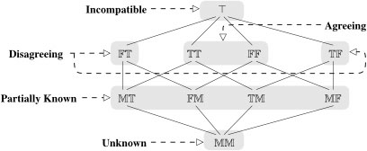 the comma category, each object is a triple <a, Our initial investigations suggest that the category of fuzzy viewpoints gives us precisely the foundation we need for composing multi-valued models . It allows us to merge inconsistent and incomplete models, and reason about the resulting composition. The framework allows us to work with different lattices for different types of analysis. For example, we demonstrate an application that uses the lattice A10 (see figure 3) to reason about the syntactic consistency of the composition of a pair of 3-valued models. This lattice allows us to label the syntactic elements of the composed model with items that the sources agree or disagree on. It also allows us to distinguish between disagreements (where the sources have different values assigned to common elements of their models) and incompatibilities, which arise if the chosen composition attempts to unify elements of the source models in such a way that we cannot consistently label them with any other single value from A10. If we resolve any incompatibilities, the remaining 9-valued semi-lattice can be used with the truth ordering of figure 1(e) for automated reasoning (e.g. model checking) of properties of the composed model.