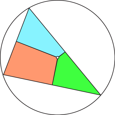 Note that this time the quadrilaterals are not equal. They are not even guaranteed to be positive. For obtuse triangles, the acute angled vertices will receive negative areas (assuming you demand their sums equal the area of the triangle). Here is a plot of voronoi areas as the angle of an isosceles triangle grows from 0 (acute) to π (obtuse). The x axis is the angle of the isosceles triangle and the y axis is area. The green line shows the area of corresponding to the vertex at the angle that's growing, the blue corresponds to the other two areas.