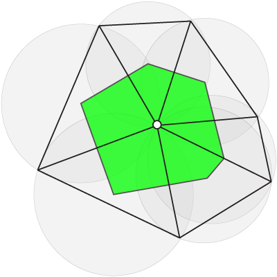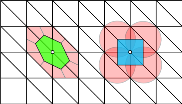 Now, notice how when the edge is flipped the barycentric area changes drastically, and actually changes for all vertices incident on the flipped edge. The voronoi however stays the same for this vertex and all vertices.