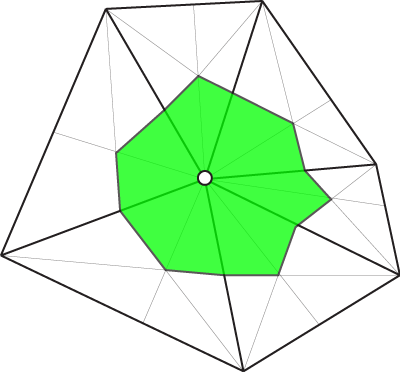 Another, also natural, choice is voronoi area. Take the circumcenter, which lies at the center of the circumscribing circle of the triangle. It follows quickly that the circumcenter is equidistant from all vertices on the triangle. Connect this point to the midpoints along the edges of the triangle, again forming three quadrilaterals.