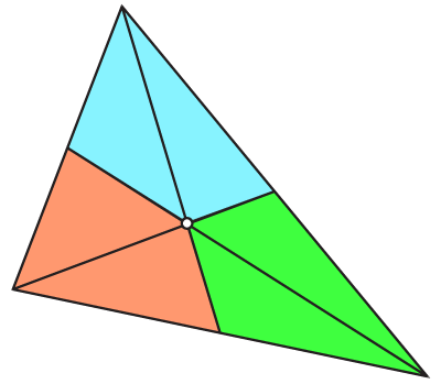 These quadrilaterals are by definition of equal area. The barycentric mass matrix entry for vertex i is the sum of its corresponding quadrilaterals from all incident triangles, or more simply: one-third of the total area of all neighboring triangles. Notice that the contribution of a triangle to its vertices is the same for all three, regardless of there placement around the triangle.