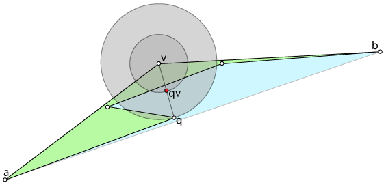 2a. If q is inside avb, compute distance to v (orthogonal to ab).