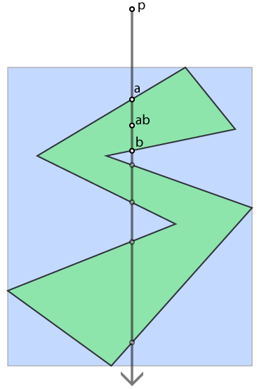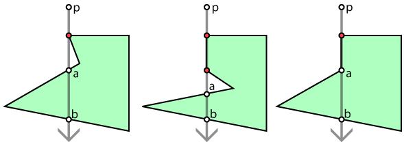 - Let a be the point at which the ray from p first passes through the boundary into the polygon (here we're careful to ignore passing through sides parallel to the ray and through corners that don't pass the ray through the boundary).
