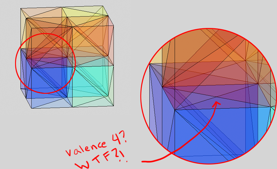 I am asking it to delaunay tessellate a regular grid where I break the rule of no more than 4 vertices on a sphere. Figures that matlab should handle this case gracefully, but okay. Good to know now that it doesn't. It doesn't even return tets flattened into triangles, its just contradictory, self-intersecting tets...