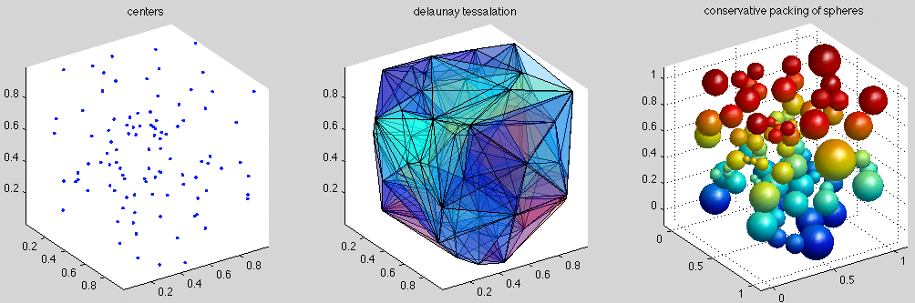 Here's a matlab snippet to create a "packing of spheres" in 3d centered at 100 random locations in the unit cube. The basic idea is to pick 100 random locations in 3D, then compute their delaunay tessellation. Then place a sphere at every location with radius equal to half the minimum distance to any of that location's neighbors in the tessalation. After you have that you could iterate over each sphere making as big as will fit: for each location check all neighbors and find the maximum radius its sphere could have before intersecting existing spheres. I'm using bubbleplot3 to display the spheres.