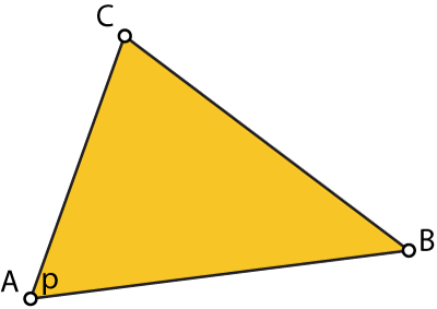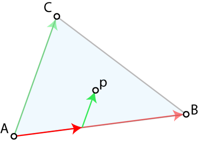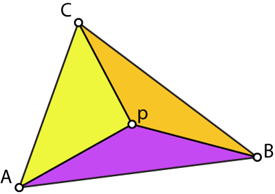 As we move p inside the triangle, ABC, the barycentric coordinates shift. Notice that all coordinates are positive as long as p is inside the triangle.
