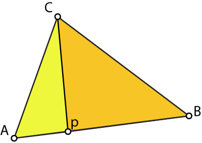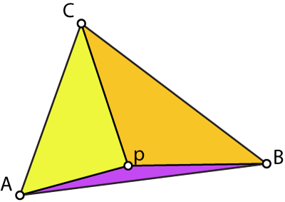 However, if we pull p off the plane of the sum of the total un-signed area of the sub triangles will necessarily be greater than the area of the original triangle. To see this notice that by pulling p off the triangle we are making a tetrahedron pABC with a certain amount of volume, where before pABC was flattened onto the base triangle ABC with no volume. Where ever p is in space it makes such a tetrahedron with ABC and we can always flatten (project) it to the plane of the triangle where we know the total area of the flattened triangles must cover (be greater than) the original triangle ABC. Now finally notice that "flattening" a triangle can never increase the triangle's area (imagine holding a paper triangle in front of your face, your eyes project it onto the plane which you see. There's no way of rotating the triangle so that the projected area (the area you see) is bigger than the actual area of the triangle)).