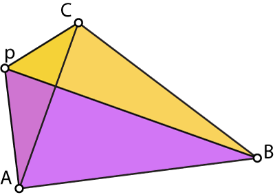 If instead of computing regular (non-negative) area, we compute signed area then even when we move p outside of ABC the areas will sum to the original area of the triangle ABC. One way to think of signed area is by looking at the orientation of the triangles. Start with p inside ABC.