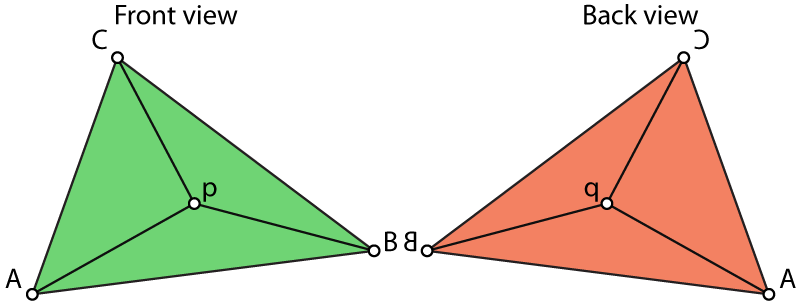 Imagine coloring the side of each triangle facing you green and the back side red. When we move p the triangles change shape, but as long as p stays inside the triangle we still see the same, green side.
