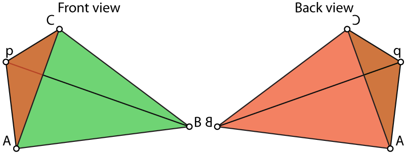 When we pull p outside the triangle the triangle on the edge we crossed gets flipped, and now we see the back, red, side. Now we declare that if we can see the green side of the triangle, its area is positive and if we see the red side of the triangle its area is negative. Now, finally notice that the red side of the flipped triangle when p is outside ABC is always covered exactly by the other two, green triangles. Thus the negative area is cancelled out and we are only left with exactly the original ABC area.