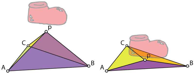 If we move p outside of the triangle the total area covered by the sub triangles will be greater than the original triangle. This is easy to see as the sub triangles always cover the original triangle. We could use this to test whether p is inside the triangle ABC, but there actually a more elegant way that will be handy later.