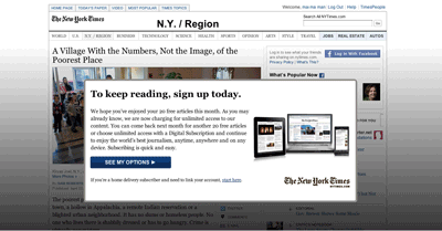Today was my first experience with the New York Times paywall. It manifested as an html overlay on top of the article I wanted to read. The article seemed to have fully loaded which made me think that if I could just get rid of the overlay I'd be able to read it.