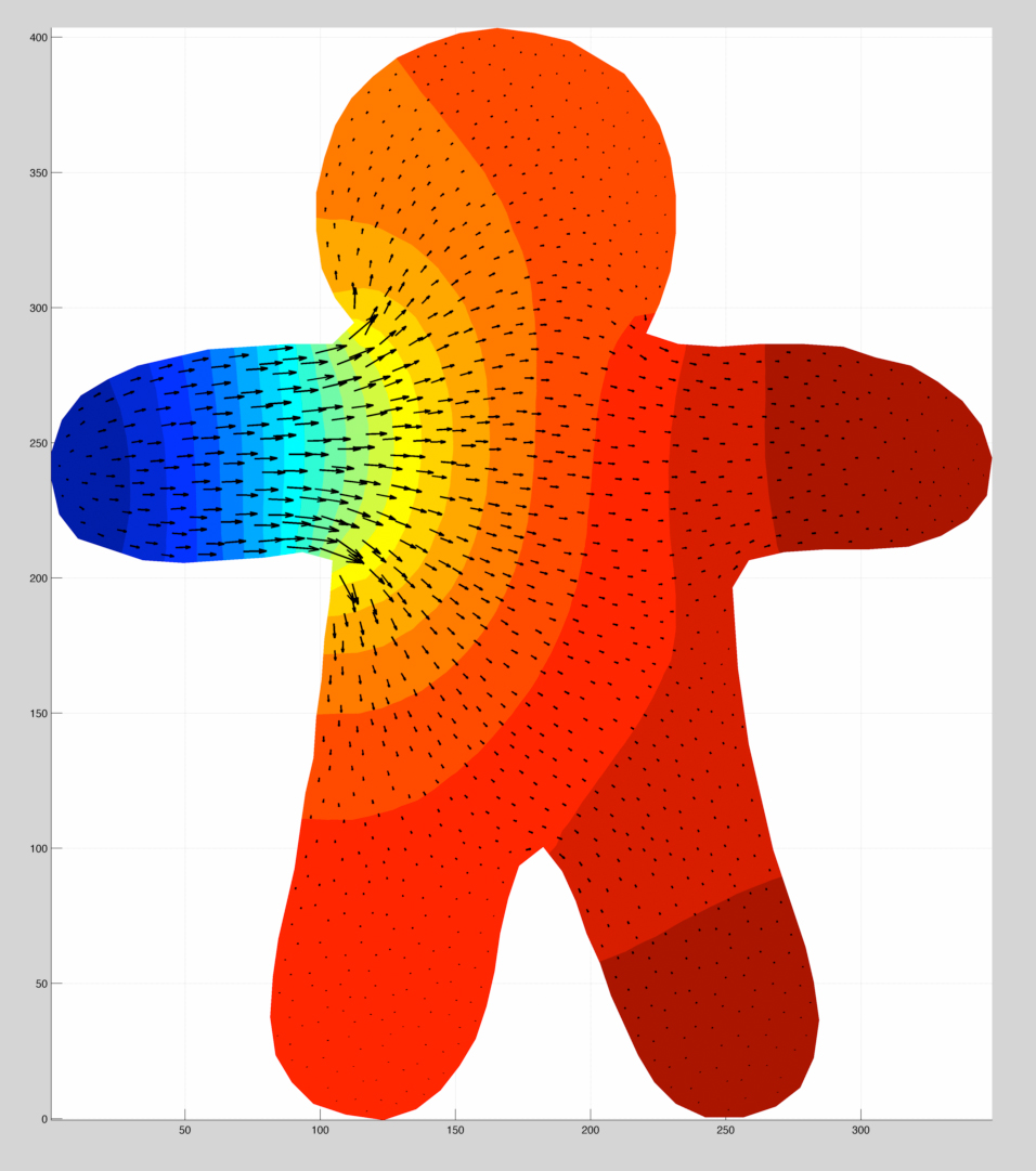 My grad and barycenter functions compute a #F*dim by #V gradient operator and #F by dim matrix of triangle barycenters respectively. This produces something like: