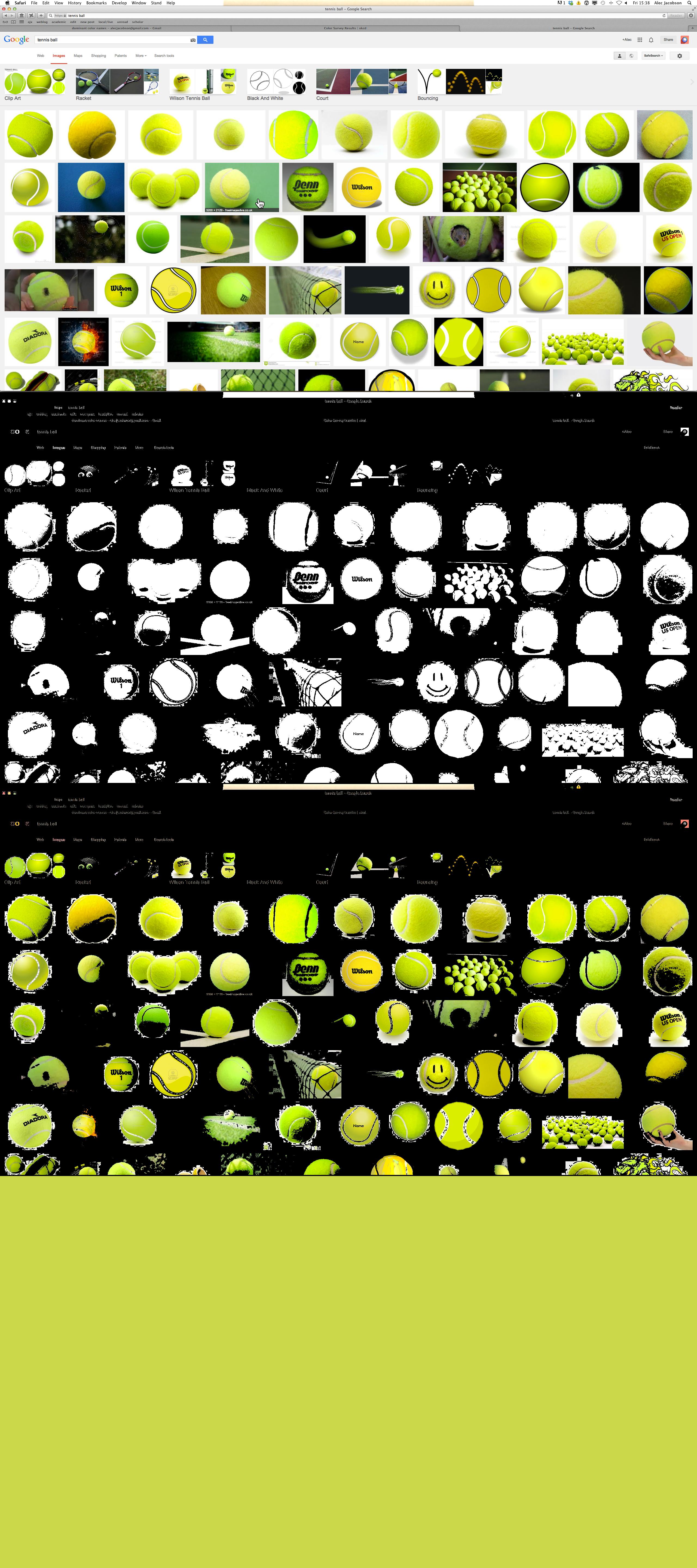 Some colleagues and I were debating this today. Of my enormous dataset so far of 6 people, 3 vote for yellow and 3 for green. Interesting the yellow votes all came from Europeans and the greens from non-Europeans. Here's a very rushed experiment to determine the average color of a tennis ball. From top to bottom: I took a screen capture of a google search for tennis ball, created a mask that mostly contains just the tennis balls, then took an average of the masked colors resulting in the solid bottom color.