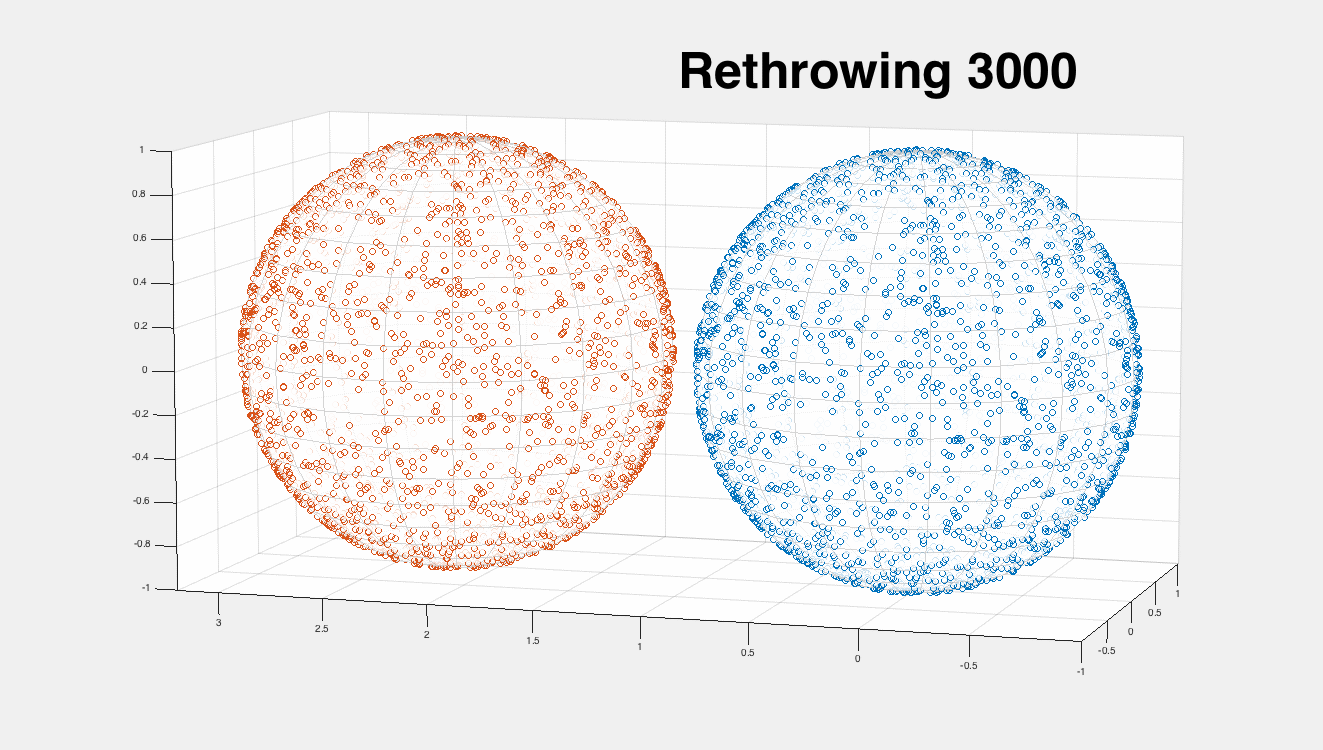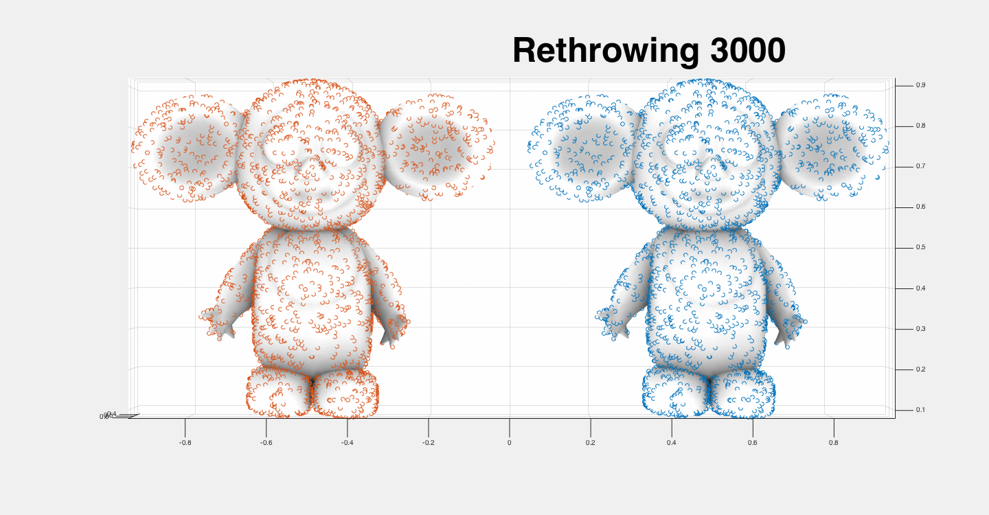 but this time re is not so obviously computed. It would be easy to compute the expected geodesic distance radius, but unfortunately the biharmonic embedding I'm using does not preserve units (i.e. dij is only relative to the geodesic distance between samples i and j on the mesh). I could probably compute the expected distortion during the lift to Rn and derive re from that. But I found it much easier to just take the average closest distance between the original n samples after being lifted to Rn. If I recall correctly, this should converge to the correct expected radius as n goes to infinity. So for large n this should be a reasonable thing to do.