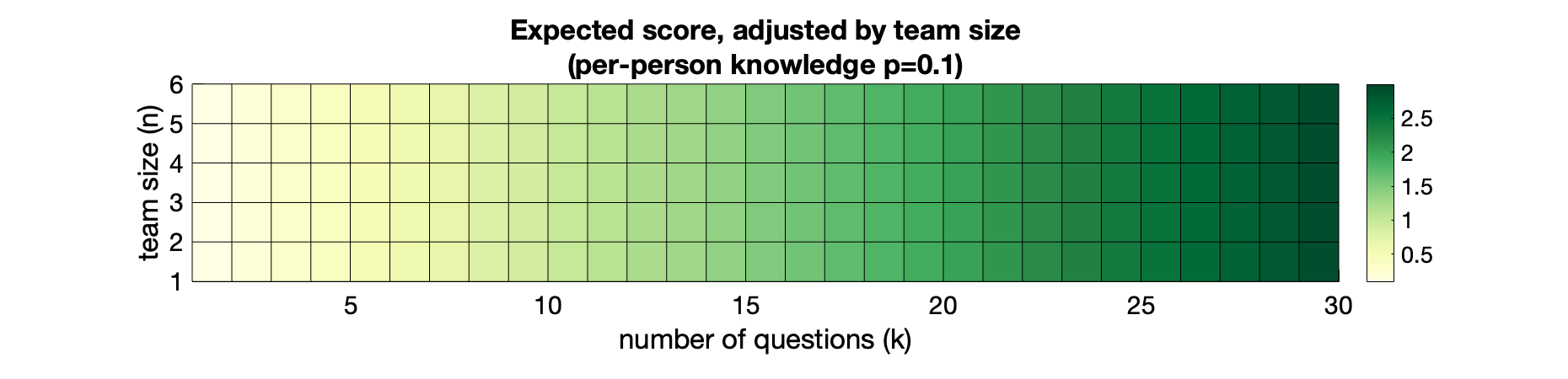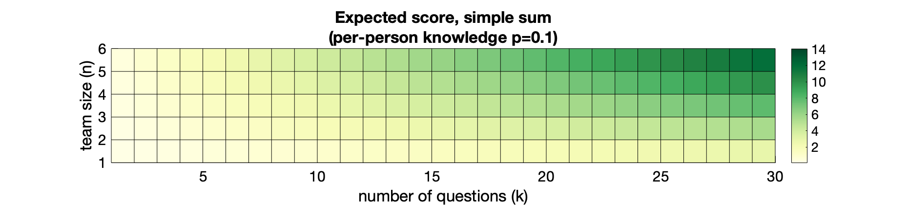 The normal scoring is to just sum up correct answers for k questions. So the expected score for the team will be: