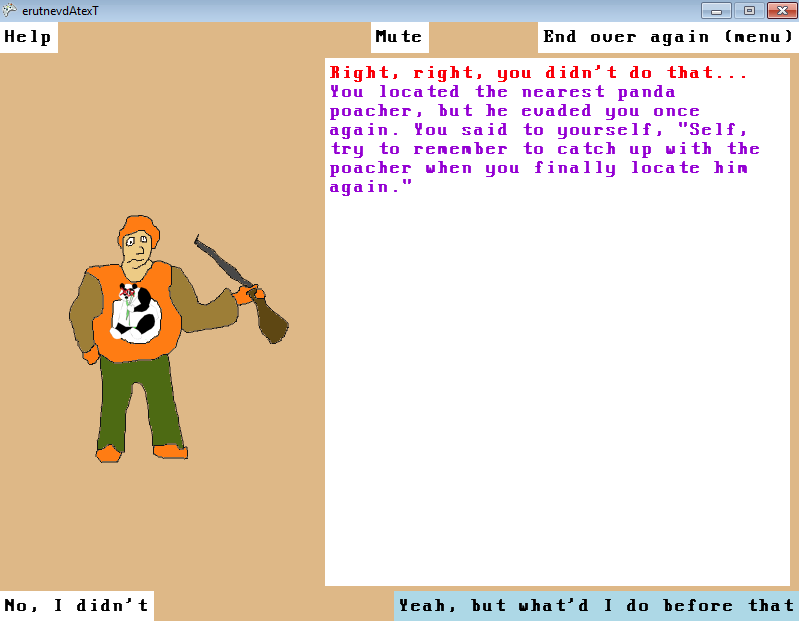 erutnevdAtxeT is my new backwards text adventure game for Windows. The idea is that when you "End a new game", you are presented with the last screen of a text adventure. You're told what happened to you. You can disagree ("No I didn't") or agree and continue backwards through the narrative ("Yeah, but what'd I do before that"). The goal is to reach the beginning screen of the text adventure: "New game..."