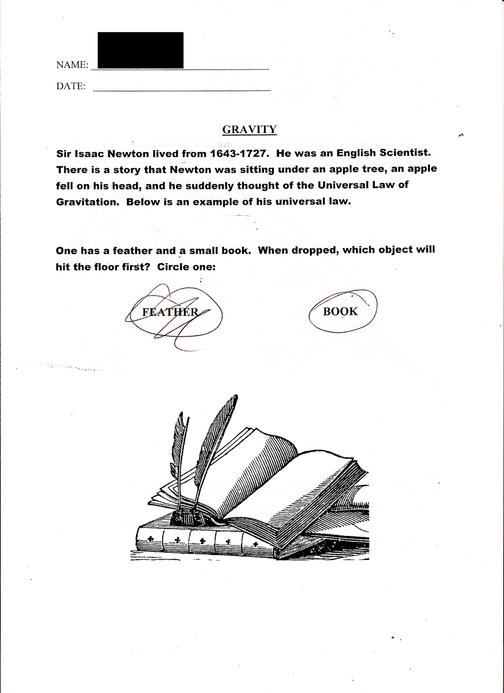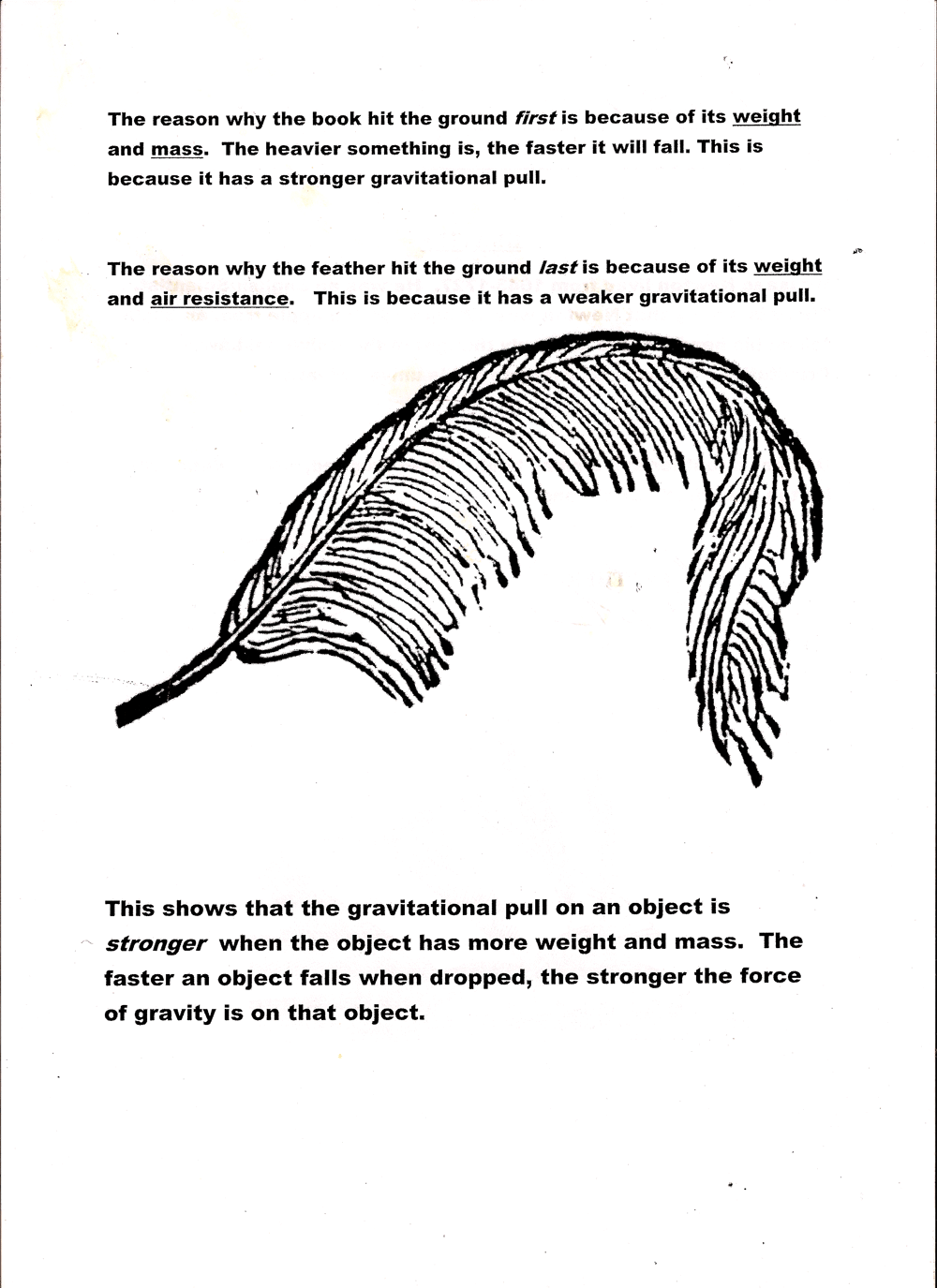 My friend recently attended an interview with the New York City Teaching Fellows program (NYCTF). It was a group interview and each candidate had to prepare a 5 minute lesson plan to present to the others. My friend told me that one of the candidates presented a lesson plan for an second grade science class. The subject was gravity and the lesson was about why a book falls faster than a feather. Why heavier objects fall faster than lighter objects. Here's a scan of the handout the candidate wrote up: