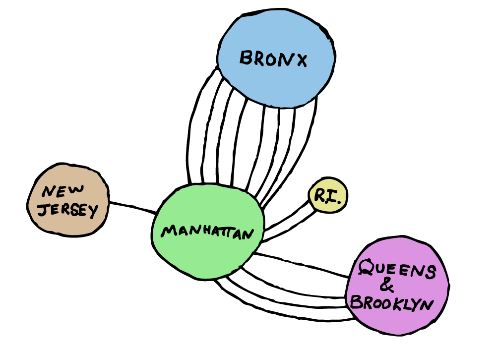 The basic idea of an Euler tour is to traverse each edge (bridge) exactly once. Notice this can only happen in the above graph if you start in New Jersey and end in Manhattan.