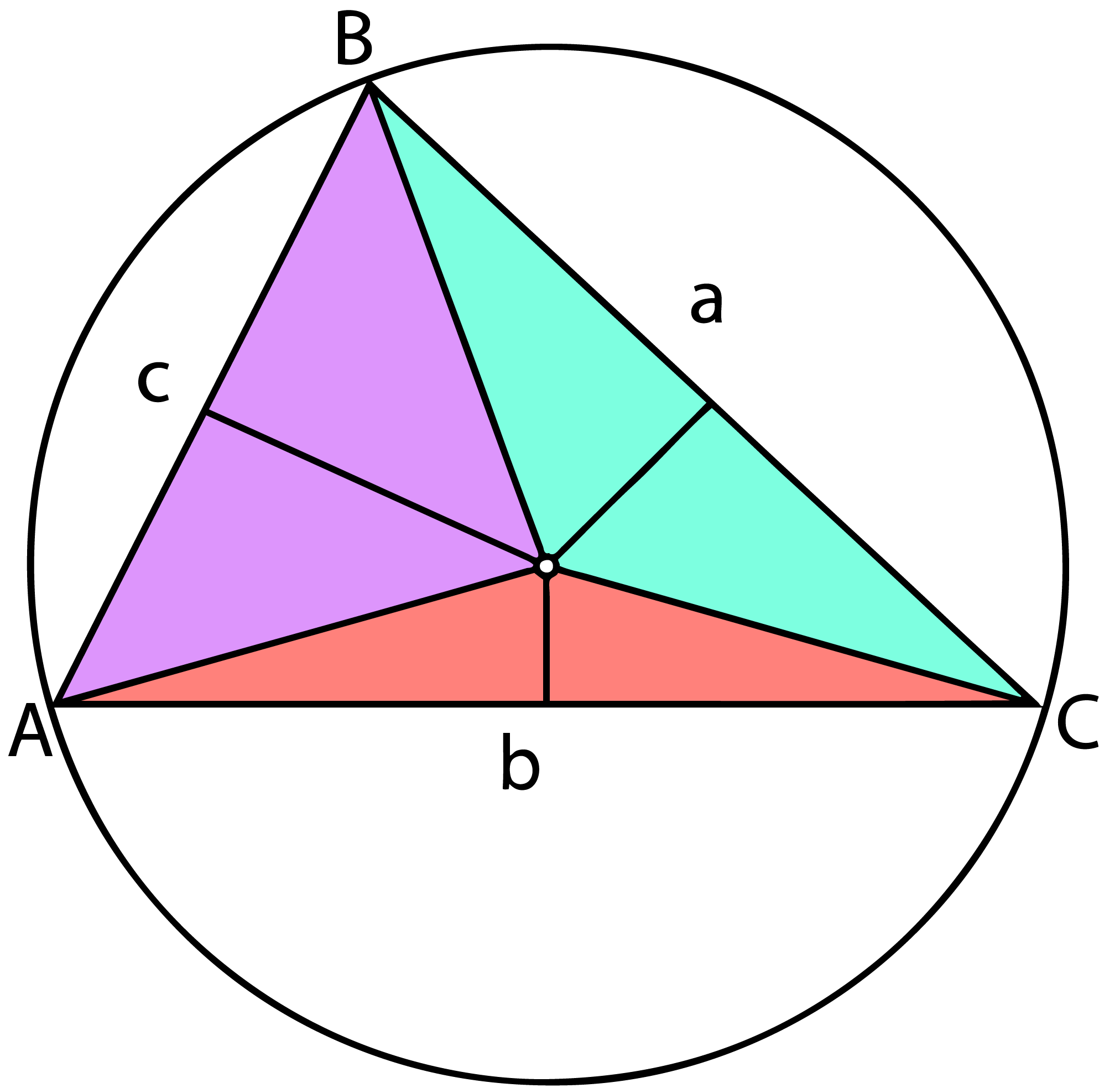 A quality of the barycentric trilinear coordinates of a point in a triangle is that they specify the relative area of inner triangles form by connecting the corners to that point. In our case, the triangles made by connecting the circumcenter to each corner. Here, the aquamarine, red, and purple triangles corresponding to points A, B, and C.