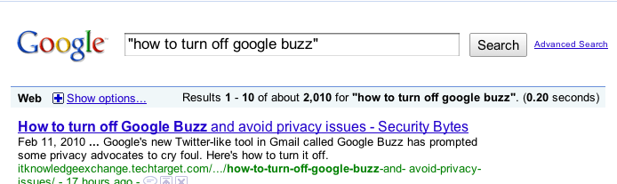 Only three days after its release (one day after google's "skip this ad" on gmail), I searched for "How to turn of google buzz" (in quotes) and found about 2010 pages containing that quote.