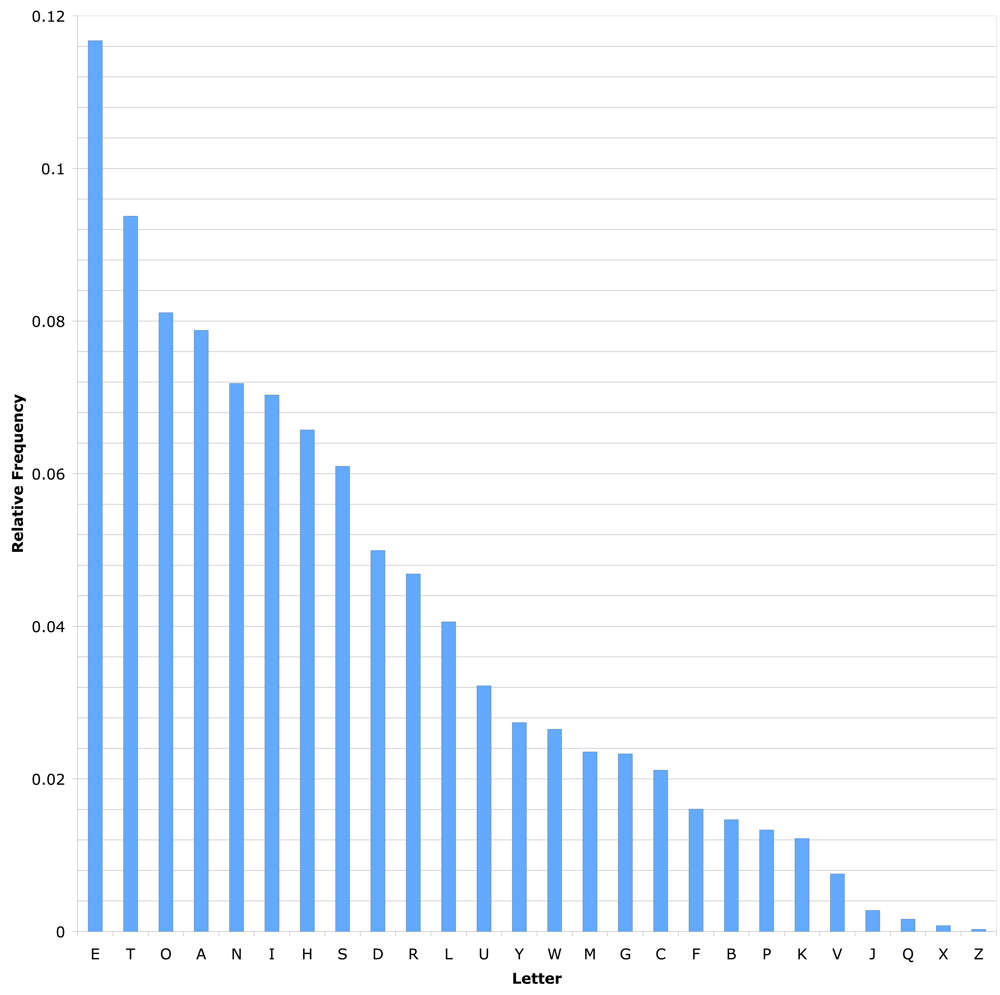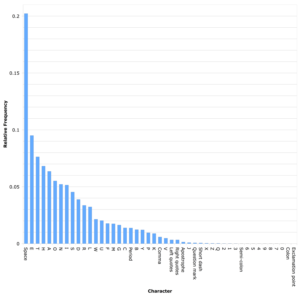 The character frequencies exhibit much more of a power-law distribution than the letters, mostly because of the space character and the uncommon punctuation marks and digits.