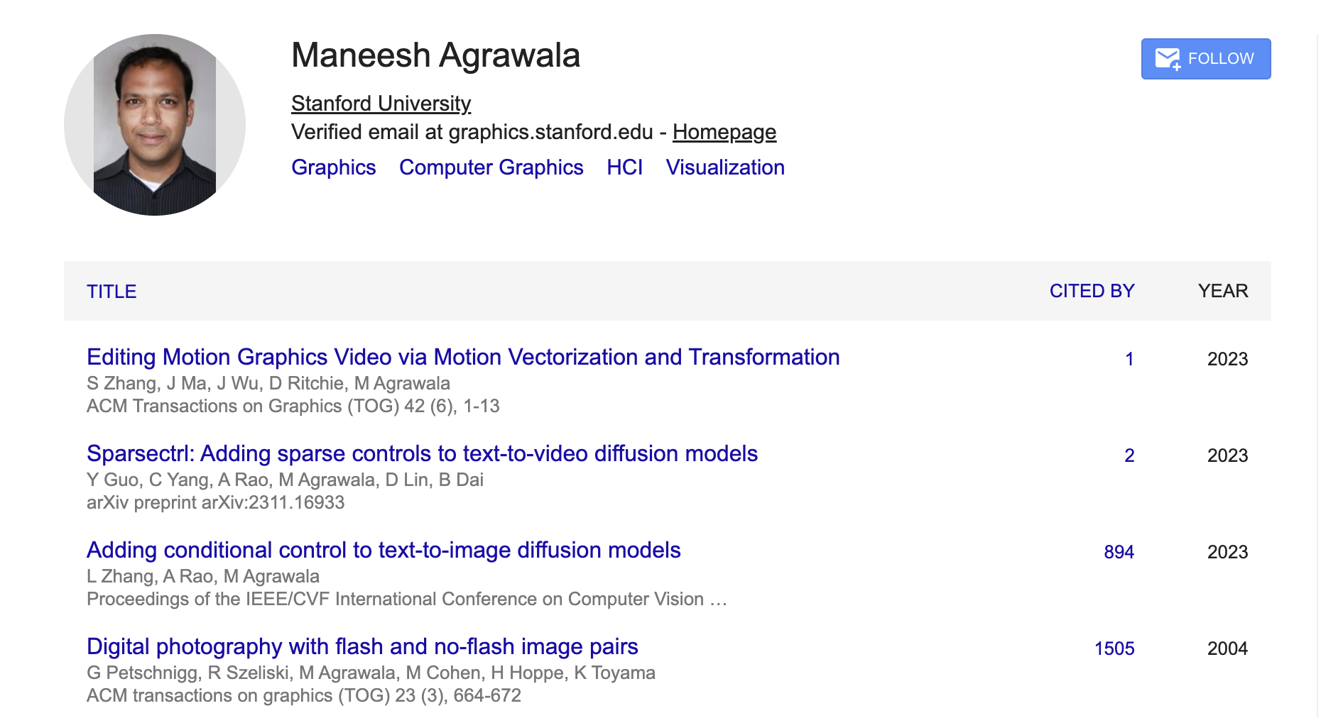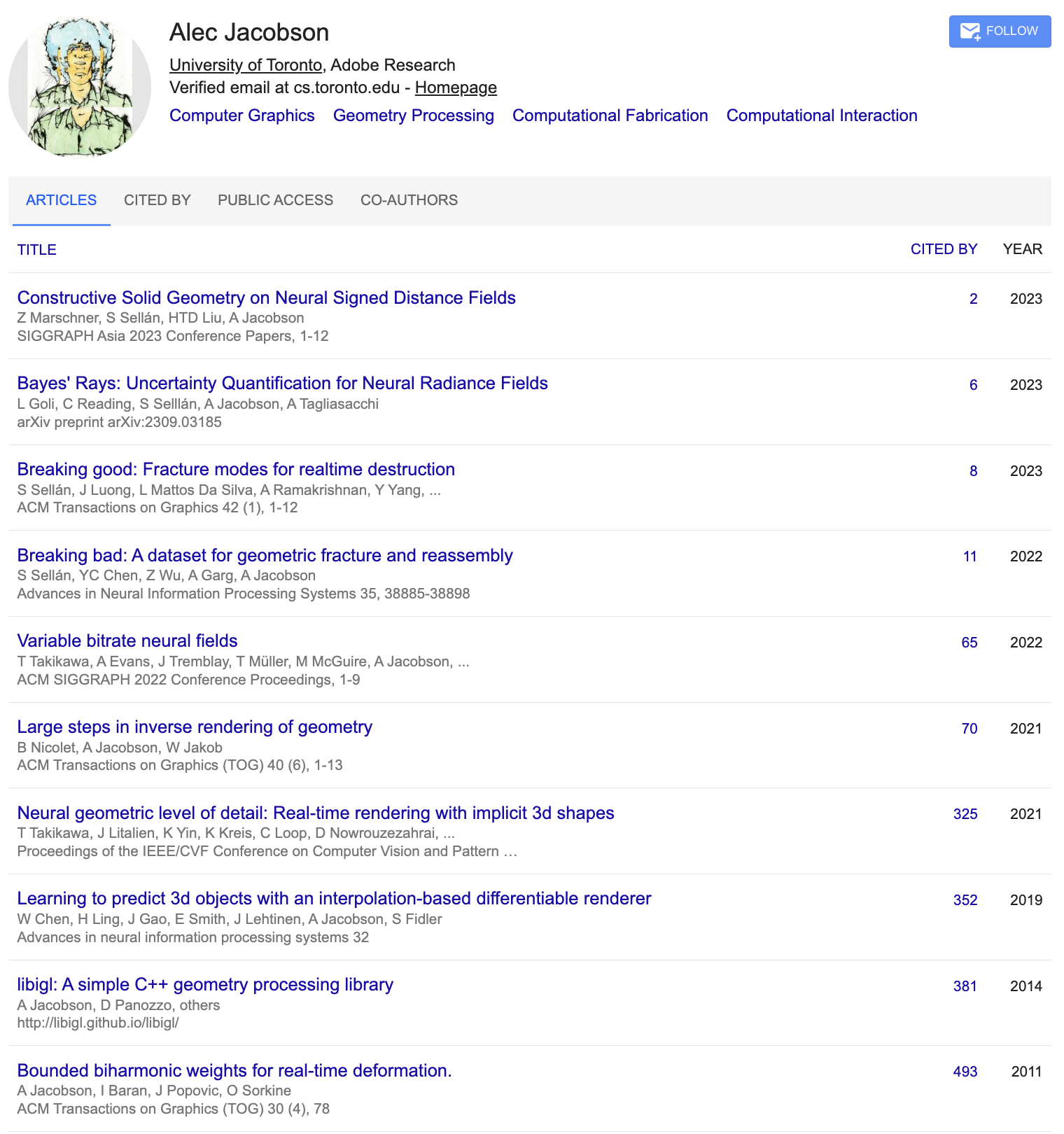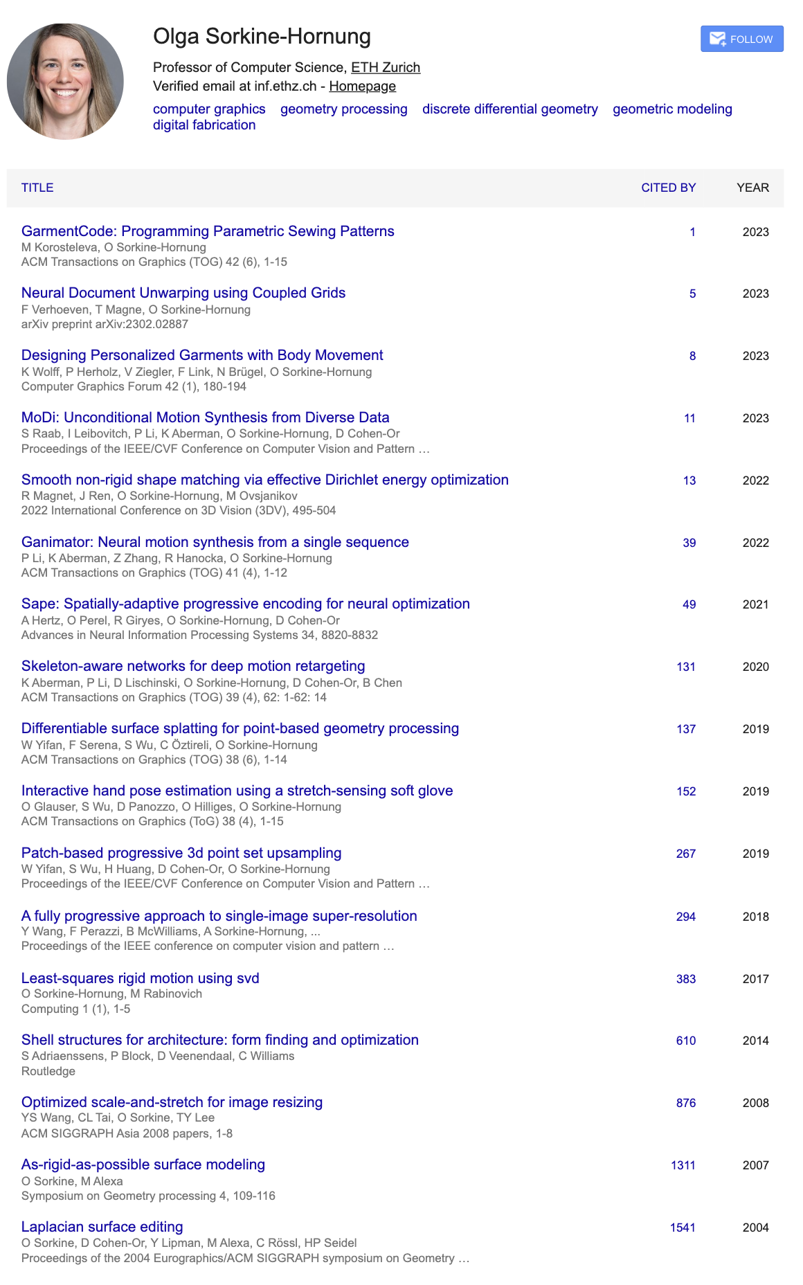 Here're a few examples. For example, here's the summarization of my PhD advisor Olga Sorkine-Hornung's publications: