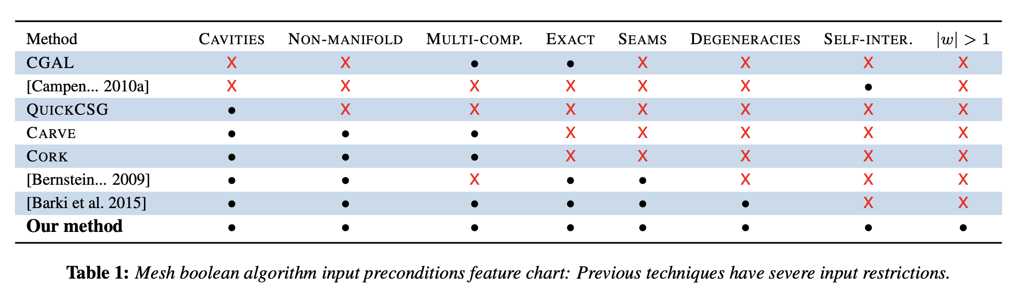 Here's a feature chart from my own paper, "Mesh Arrangements for Solid Geometry":
