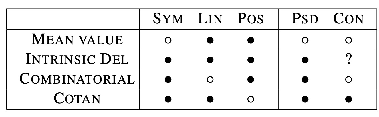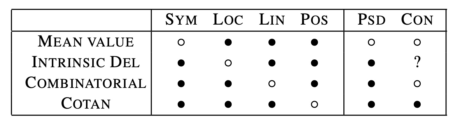 Before publication, friends at Caltech revealed that they were about to publish a new method for constructing instrinsic Delaunay Laplacians (the Intrinsic Del row). This soured the premise. Suddenly, a method would soon be announced that would indeed satisfy all three features.