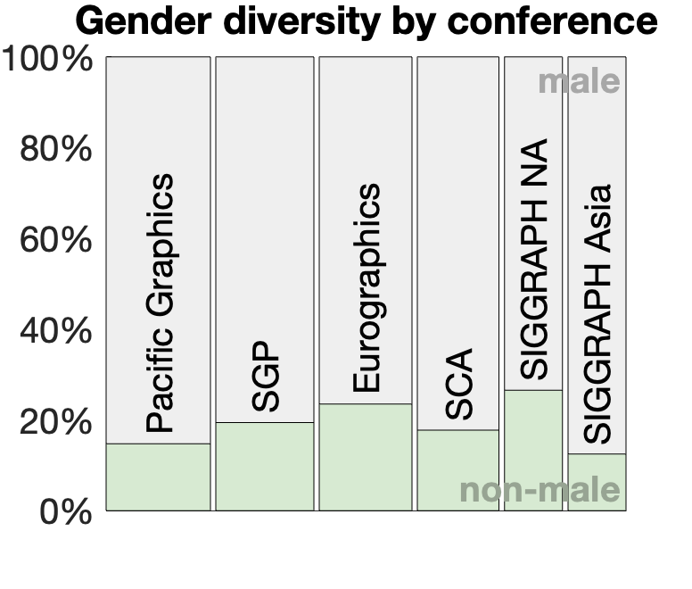 The most fraught aspect of this kind of data collection is the categorization of other people’s gender. I’ll purposefully refer to perceived gender to emphasize that this is not the result of self-reporting, which would have been better3. Gender is not binary. The primary goal of this data collection is to emphasize the enduring lack of non-male people in leadership roles at disproportionate rate compared to: society at large and some computer science undergraduate populations (e.g., ≈49% women at CMU4), though perhaps not computer science faculty populations (e.g., ≈24% of budgetary tenure-stream computer science faculty at University of Toronto) or computer graphics faculty populations (e.g., ≈15% of PhD-supervising, SIGGRAPH-publishing faculty in Canada).