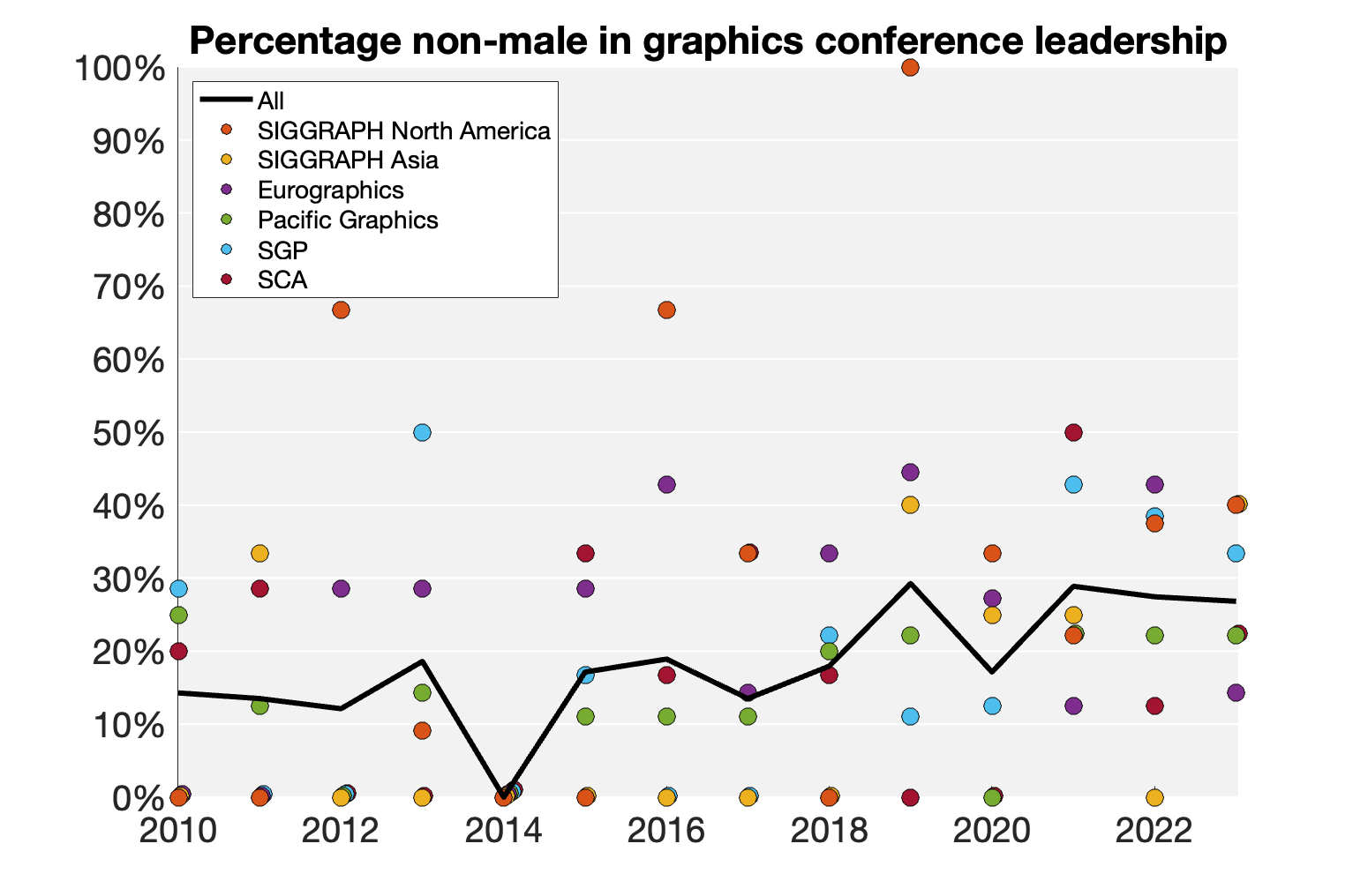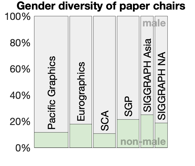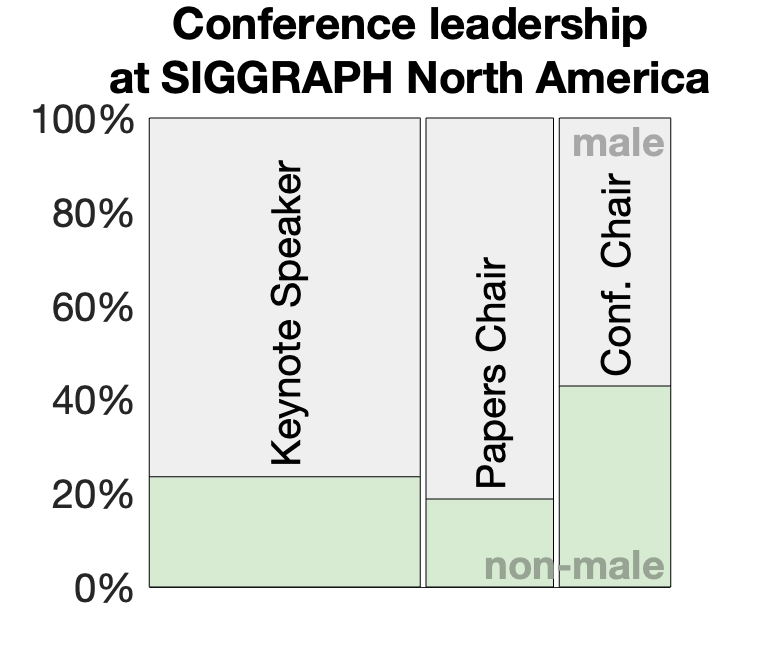 In 2014, all six conferences failed to fill a single position with a non-male person. All-male leaderships continue as recently as SIGGRAPH Asia 2022.
