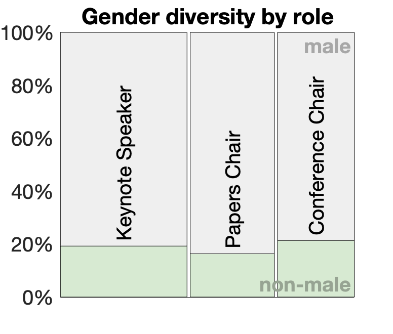 Meanwhile, papers chairs appear to have the least gender diversity. Looking across conferences we see: