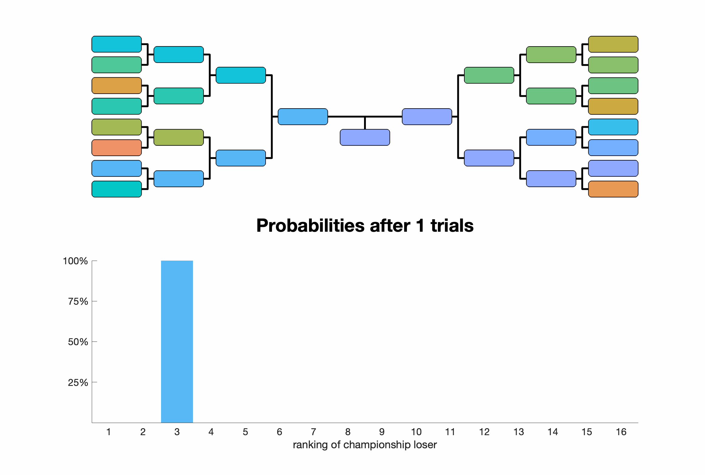 The new year leads into a bunch of playoff seasons in North American sports. Seeing the visualizations of playoff brackets got me wondering how often the team that loses in the championship game ("silver medalist") is the second best team in the tournament. Maybe the second best team was actually eliminated by the best team earlier in their bracket. It makes it seem that all we really know about the championship loser is that they're better than their own bracket: or only 50% of the teams. That's not very impressive! Or can we say more?