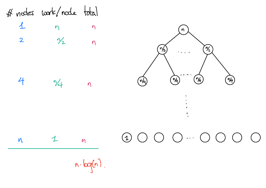 Let’s say \(n = 2^k\) for some \(k\). Then eventually, we get to... \[ T_\mathrm{MS}(n) = 2^kT_\mathrm{MS}(n/2^k) + kn = nT_\mathrm{MS}(1) + kn = \Theta(n\log(n)) \]