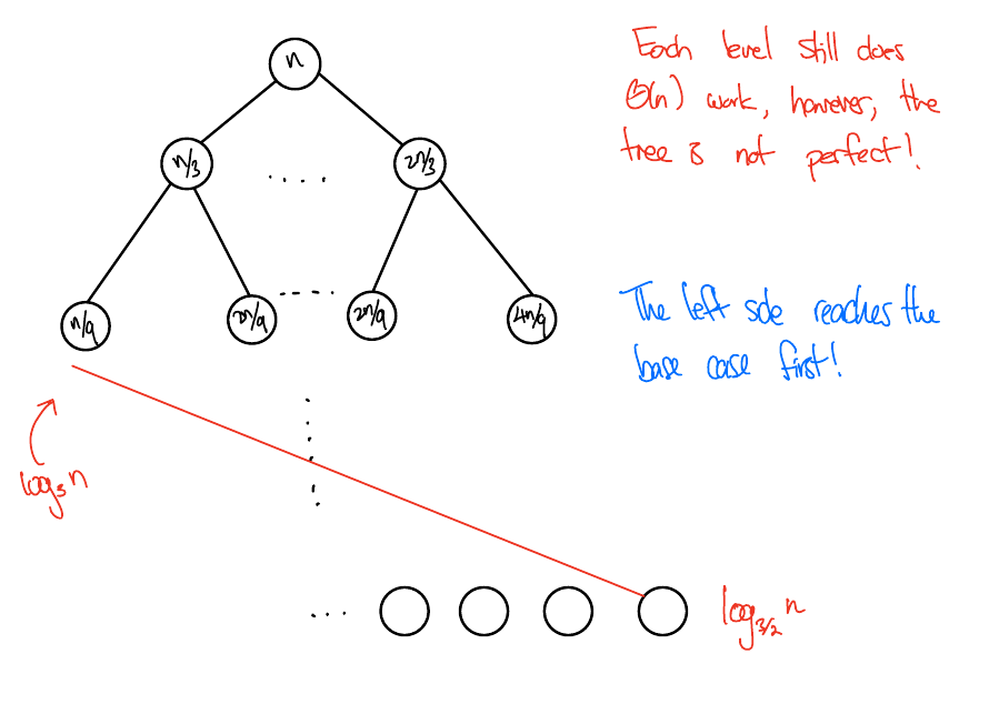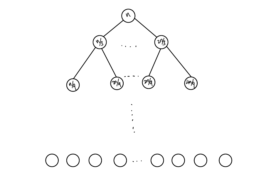 Upper bound: Imagine levels below \(\log_3(n)\) also do \(n\) work. In this case, we do \(n\) work for \(\log_{3/2}(n)\) levels, so again guess \(n \log(n)\).