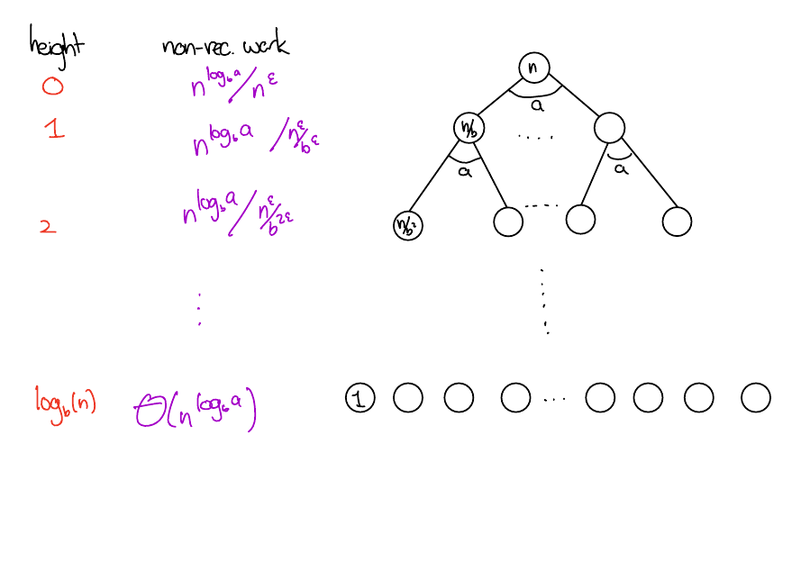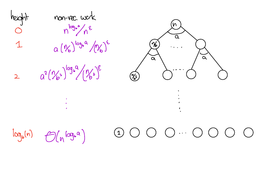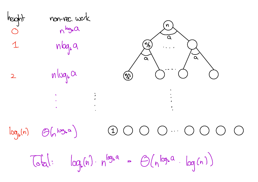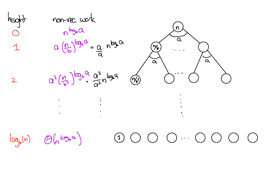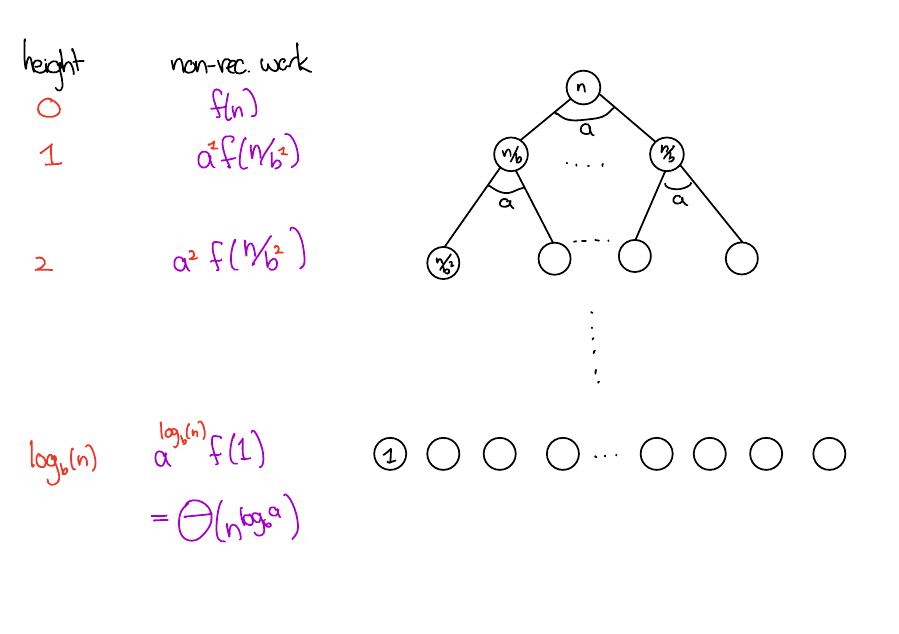 - Leaf work. \(a^{\log_b(n)}\cdot f(1) = \Theta(n^{\log_b(a)})\). (see here for details)