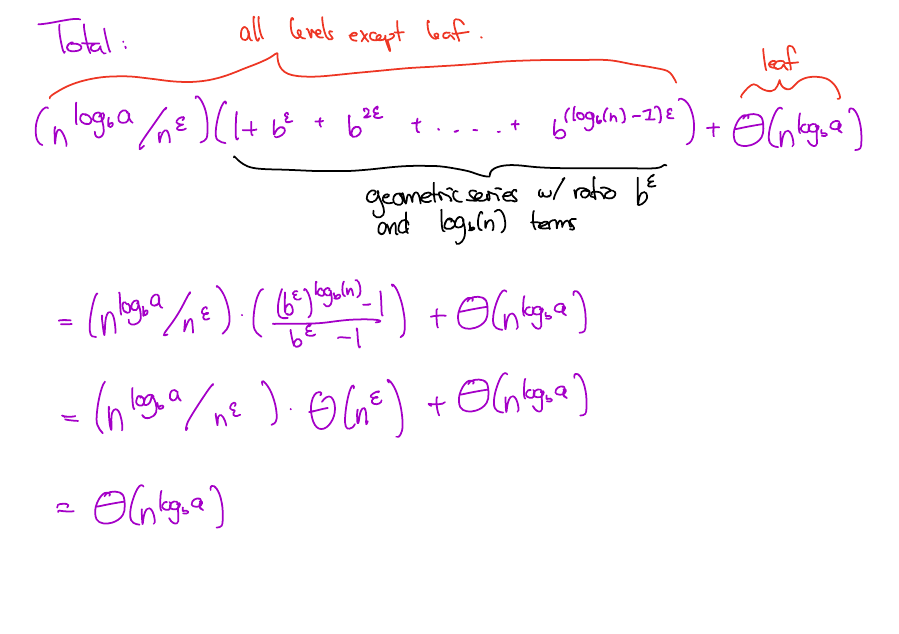 Before we prove the Master Theorem, let’s review geometric series. A geometric series is a sum that looks like \[ S = a + ar + ar^2 + ... ar^{n-1} = \sum_{i=0}^{n-1} ar^i \]
