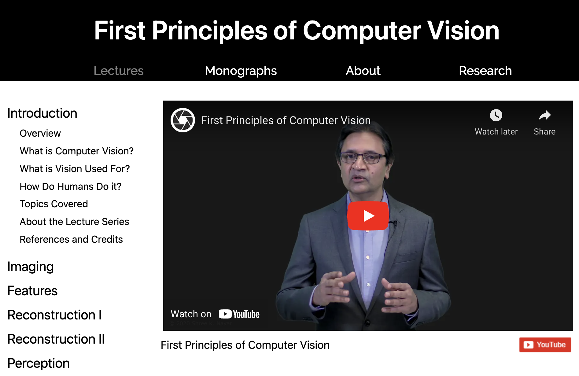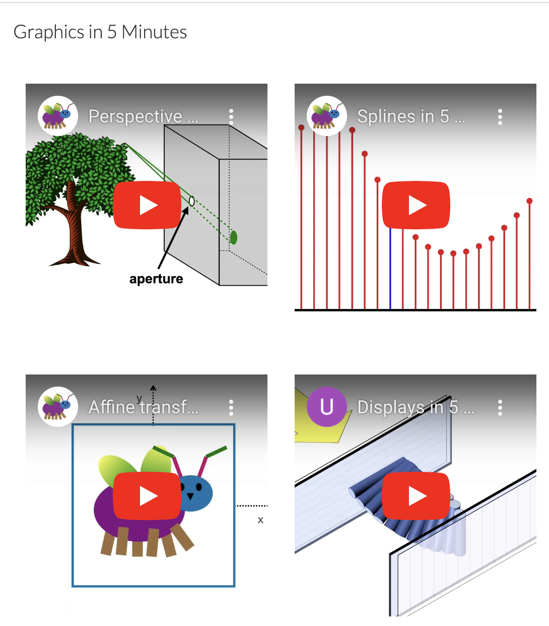 For the first half of the course, selected cartoon videos from Steve Seitz' "Graphics in 5 minutes (G5M)" channel on youtube must be watched before each week's lecture. In addition to these videos, Shree Nayar's video lectures on the First Principles of Computer Vision are an excellent source of lectures for optional viewing after class. See the course schedule for full details.