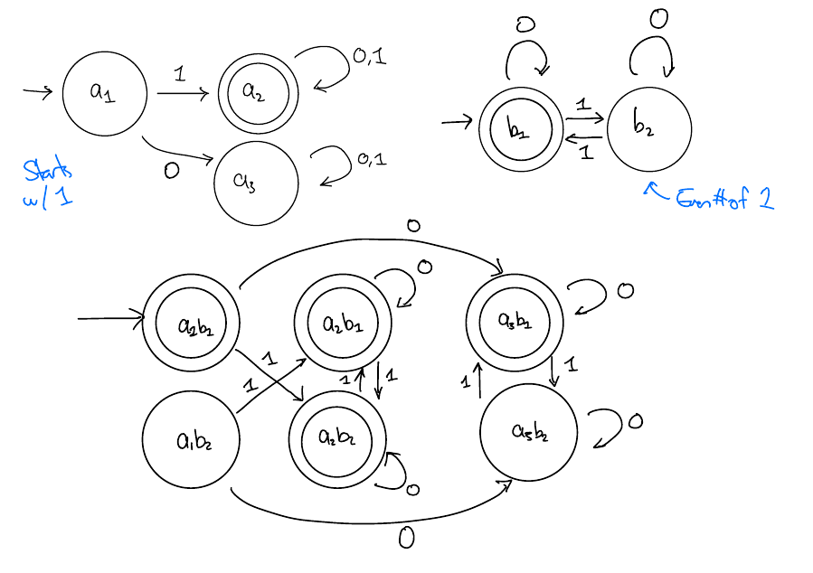 Idea 2: Instead, we need to run the two machines in parallel. Thus, each state in \(D\) corresponds to a 2-tuple where the first element is the ‘M’ state and the second element is the ‘N’ state.